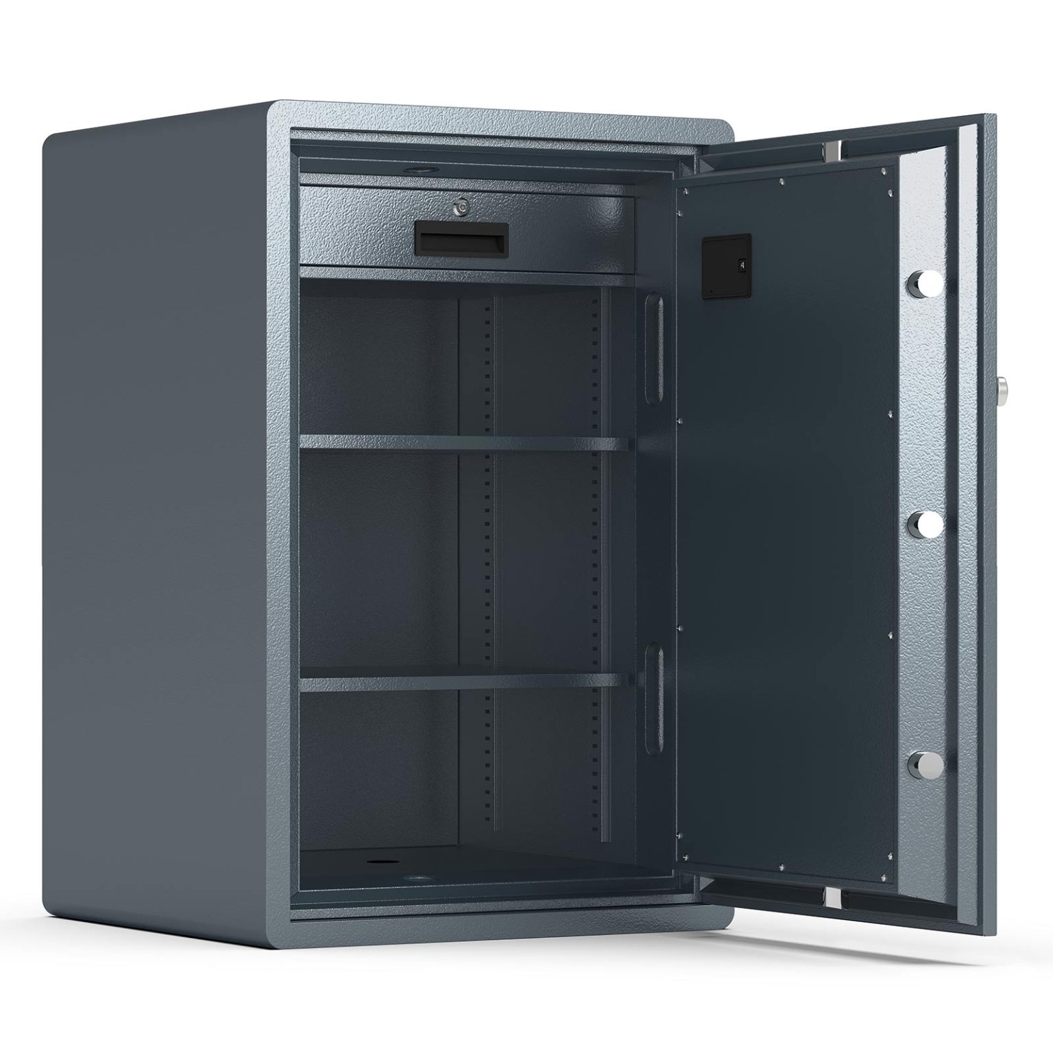 - Includes fingerprint access, electronic code, and a manual key for emergency situations.